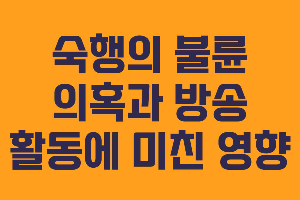 숙행은 최근 불륜 의혹으로 큰 논란에 휘말리며 방송 활동에 심각한 타격을 받고 있다. 이 사건은 JTBC의 시사 프로그램을 통해 처음 알려졌고, 이후 관련 영상의 조회 수는 급격히 증가하였다. 숙행이 출연 중이던 ‘현역가왕3’ 프로그램에서는 그녀의 출연 장면이 통편집되는 등 신속한 대응이 이루어졌다. 이러한 상황은 그녀의 팬들에게 큰 아쉬움을 남겼다.