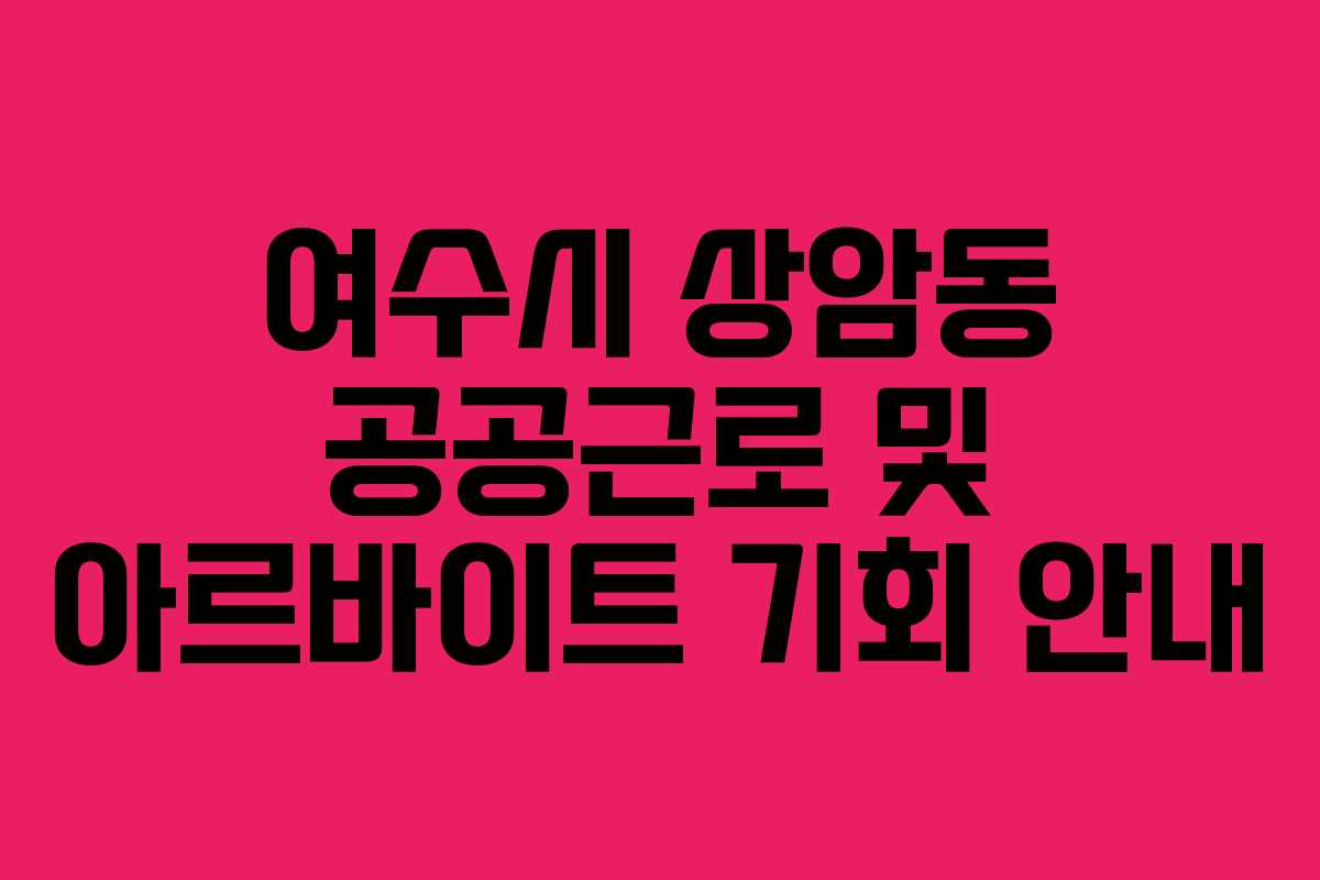 여수시 상암동에서는 청소년, 중장년, 노인을 위한 다양한 공공근로 및 아르바이트 기회를 제공합니다. 환경 정화, 행정 지원, 공공시설 관리 등의 분야에서 일자리가 있습니다.