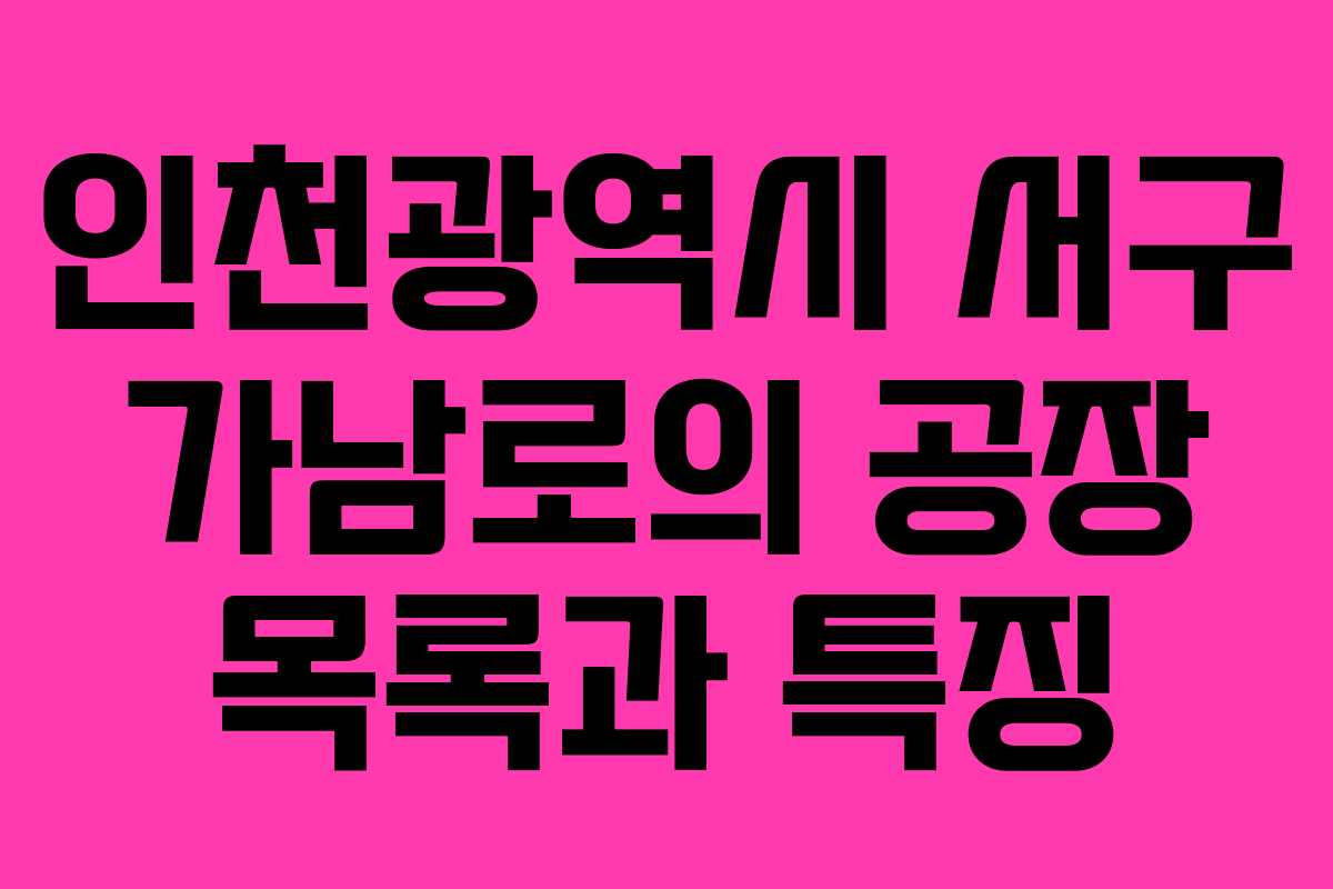 인천광역시 서구 가남로에 위치한 다양한 공장들은 각기 다른 산업 분야에서 활동하고 있으며, 이 지역의 경제를 구성하는 중요한 요소로 자리잡고 있다. 이 글에서는 해당 지역에 있는 공장들의 목록과 그들의 주요 생산품, 주소 및 연락처 정보를 정리하여 제공한다.