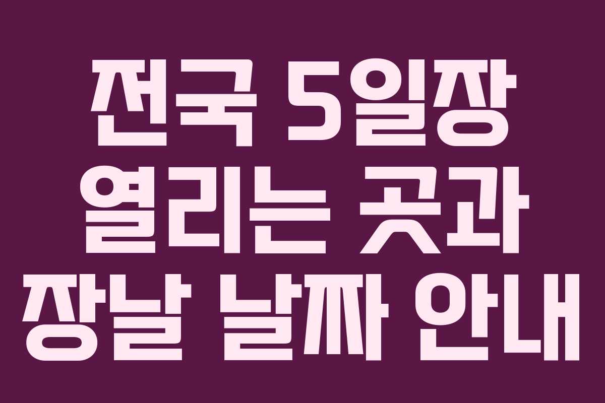 각 지역의 장날 정보를 참고하여, 신선하고 건강한 지역 특산물을 만나보시기 바랍니다. 이러한 5일장은 지역 경제 활성화에 큰 기여를 하고 있으며, 다양한 제품을 경험하는 기회를 제공합니다.