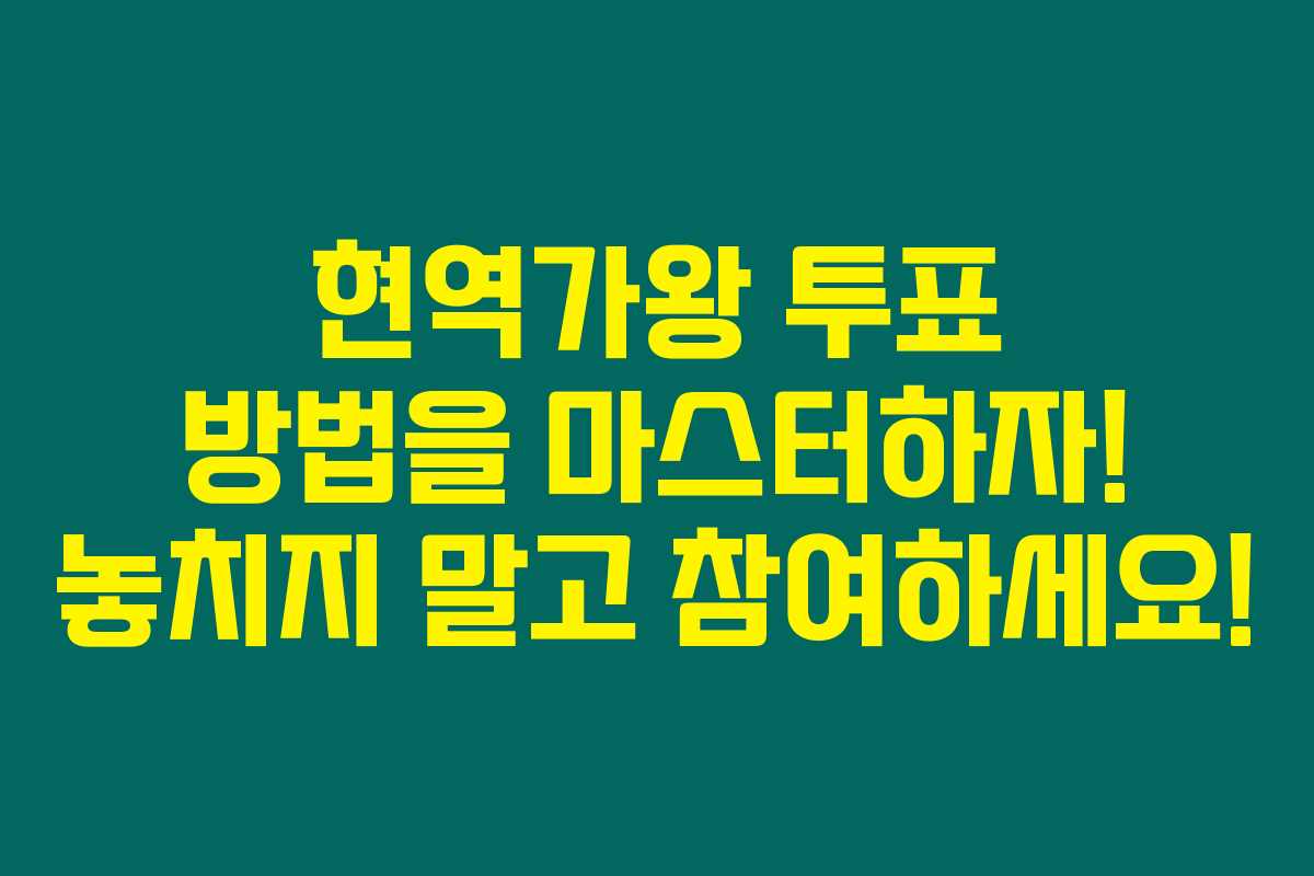 현역가왕에 투표하기 위해 어렵게 고민하고 있는 당신에게 드리는 완벽 가이드입니다. ‘현역가왕 투표하기 정보를 찾고 있는데 잘 모르겠어요?’ 우리의 고민과는 상관없이 귀한 한 표를 행사할 수 있는 방법을 아래에서 자세히 알려드릴게요. 놓치기 아까운 기회를 활용해보세요!