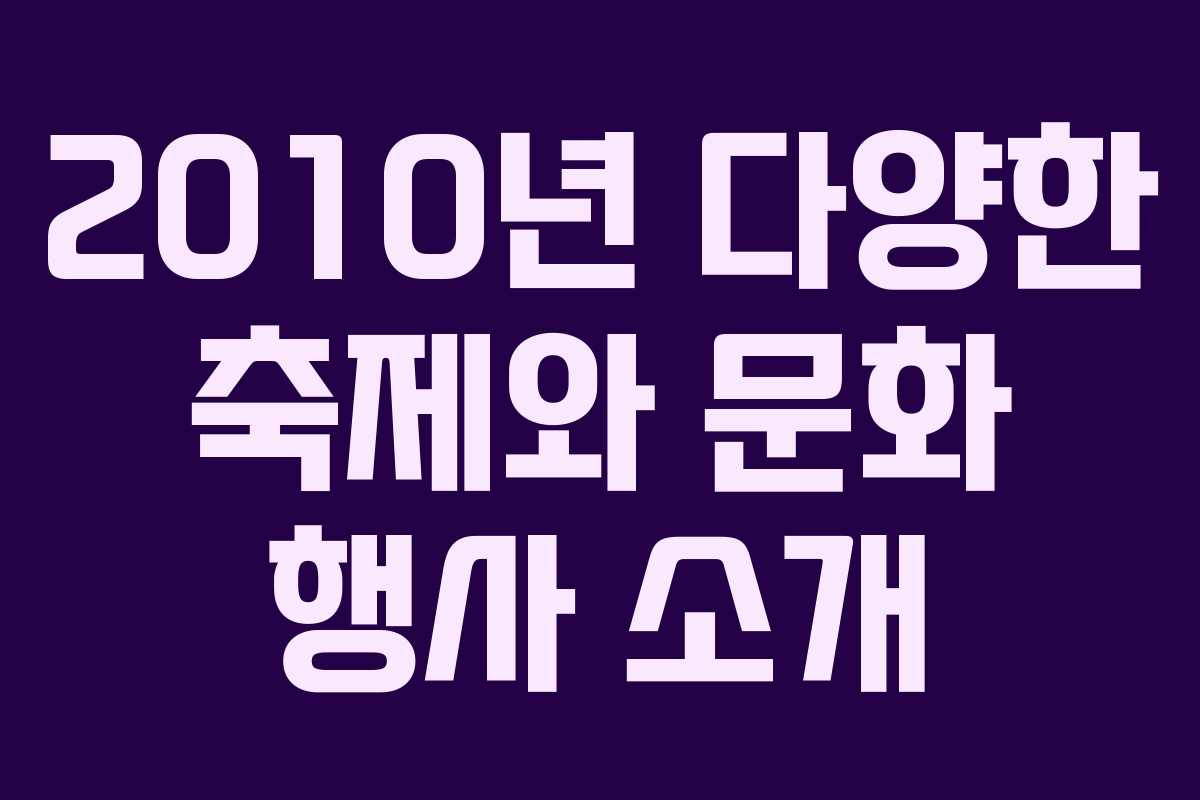2010년은 전국적으로 다양한 축제와 문화 행사가 열렸습니다. 각 지역에서 진행된 이 행사들은 인문학적 가치뿐만 아니라 문화예술의 향유를 위한 좋은 기회가 되었습니다. 이번 글에서는 주요 행사들을 소개하고, 각 지역의 독특한 매력을 살펴보겠습니다.