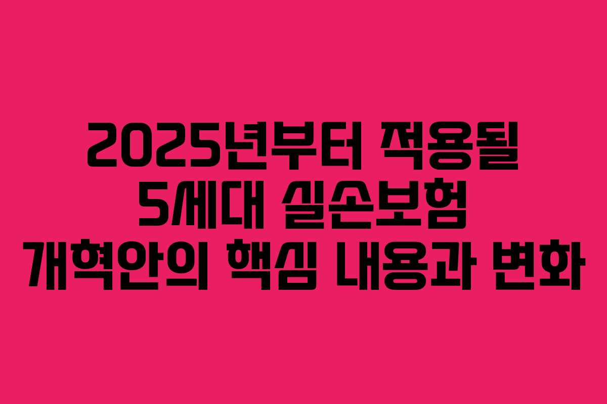 2025년 1월부터 시행될 5세대 실손보험 개혁안은 보험 시장에 큰 변화를 가져올 예정이다. 이 개혁안의 주요 사항은 보장 범위의 조정과 보험료 구조의 개선 등으로 요약할 수 있다. 이에 따라 소비자들은 더 나은 보험 혜택을 누릴 수 있을 것으로 기대된다.
